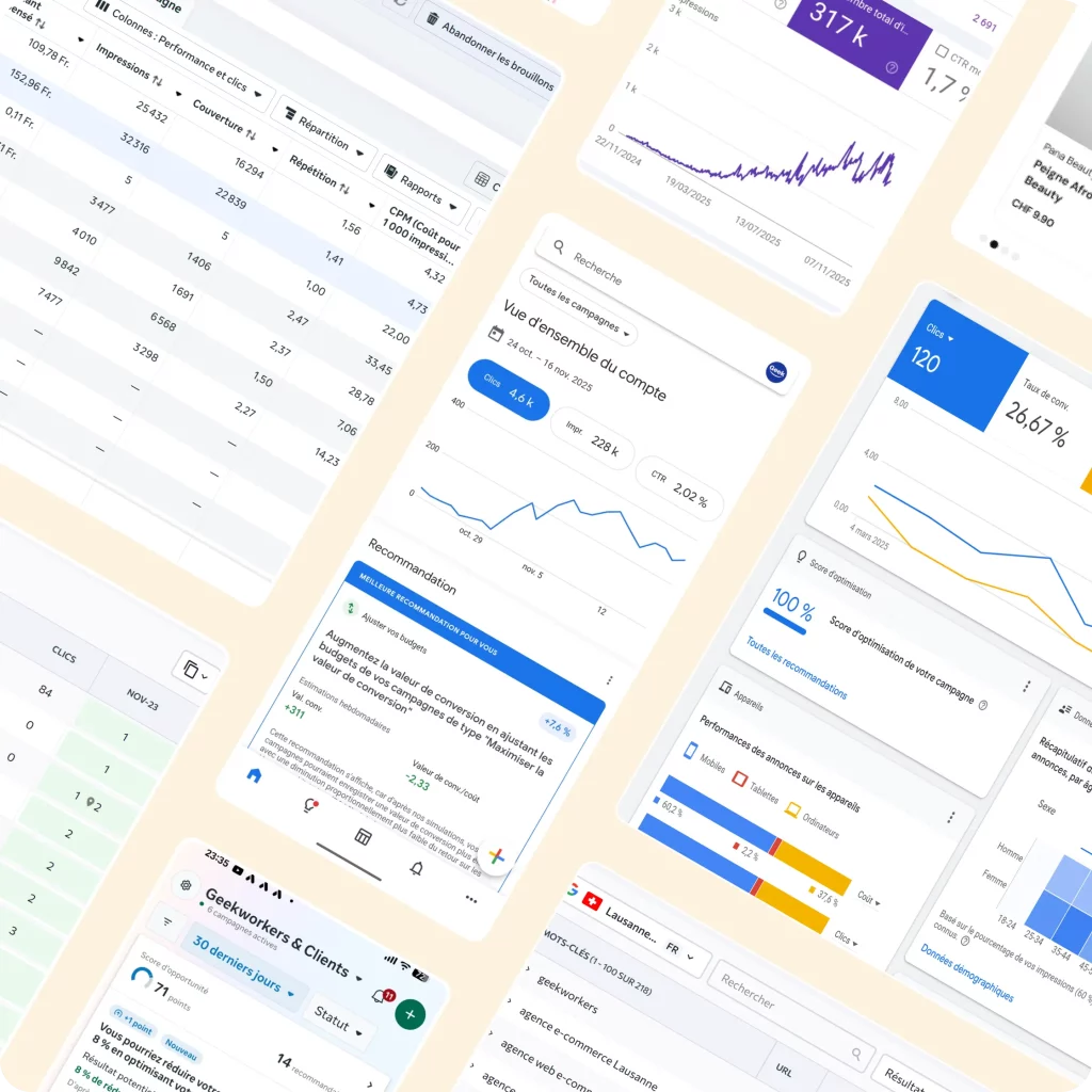 Nous maîtrisons Google Ads, Meta Ads, la création de sites internet et de landing pages avec WordPress, le développement d’application Web et Mobile avec l’IA, l’optimisation UX/UI et la conception de maquettes avec Figma. Cette polyvalence nous permet de proposer des solutions sur mesure, performantes, parfaitement adaptées à vos besoins et votre budget.